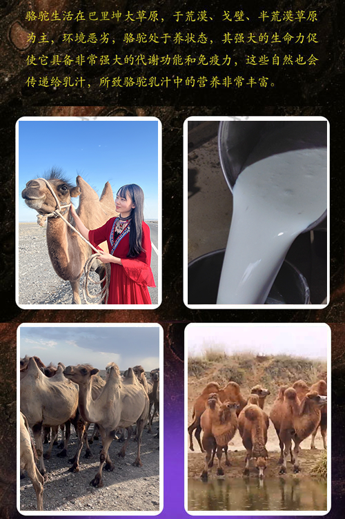 1、天下骆驼,新疆古最好:新疆古素有“骆驼故乡”的美称——新疆古阿拉善大草原,于荒漠、戈壁、半荒漠草原为主,天然无污染,生存环境却很恶劣,骆驼其强大的生命力促使它具备非常强大的代谢功能和免疫力这些自然也会传递给乳汁,所致骆驼乳汁中的营养非常丰富。